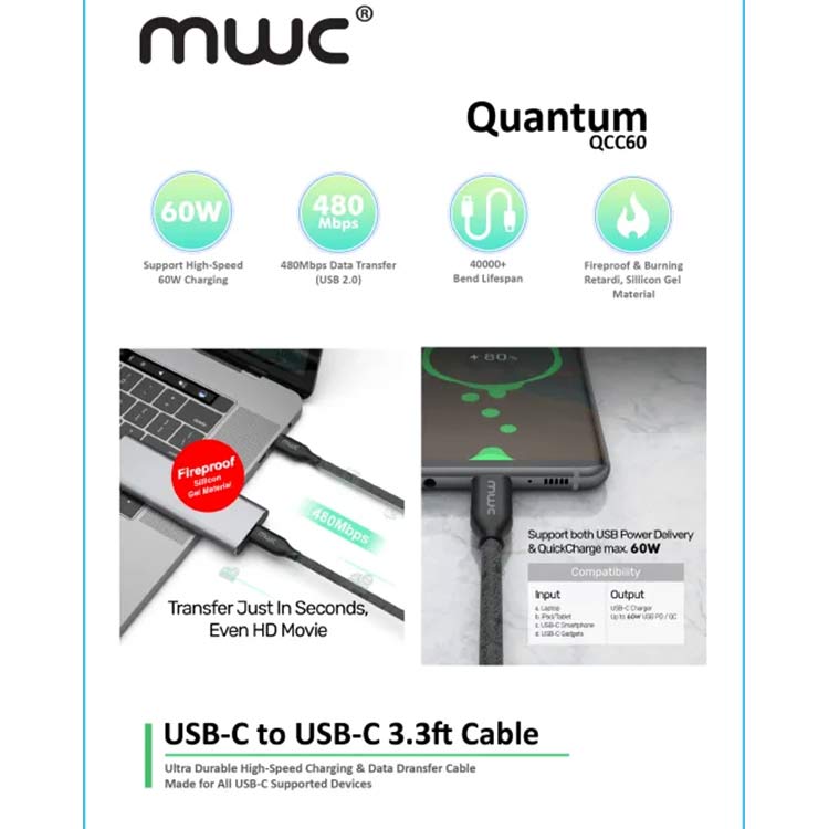 Charge your devices safely and efficiently with the MWC Quantum QCC60 Type-C to Type-C Cable. Supports up to 60W fast charging, 480Mbps data transfer, and is built to last with over 40,000 bends. Fireproof, ultra-premium, and perfect for daily use.