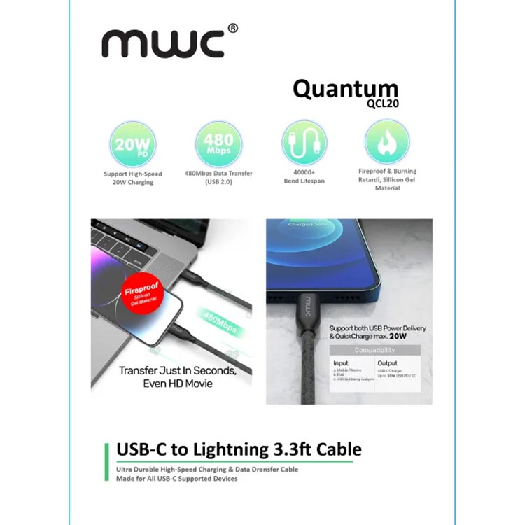 Charge your iPhone, iPad, and other supported devices safely and quickly with the MWC Quantum QCL20 Type-C to Lightning Cable. Supports up to 20W fast charging, 480Mbps data transfer, and built to last with over 40,000 bends. Fireproof, durable, and ultra-premium quality for everyday use.