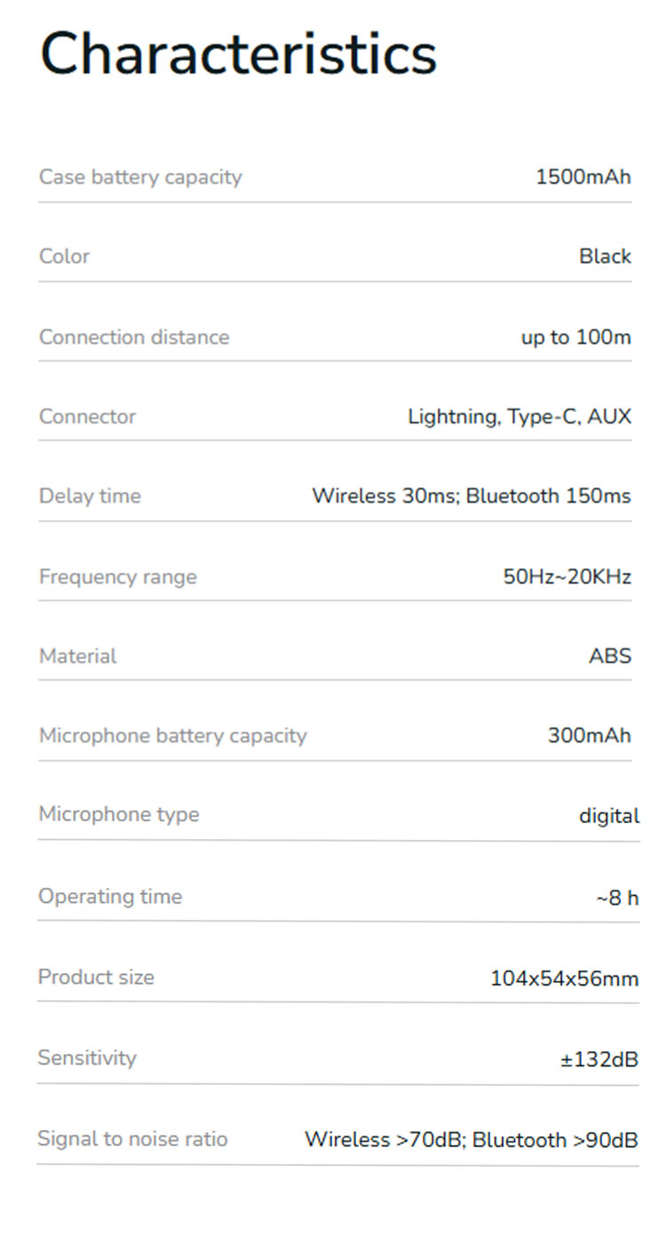 Battery: Microphone 300 mAh (≈ 8 hrs), Case 1500 mAh (≈ 10 hrs)